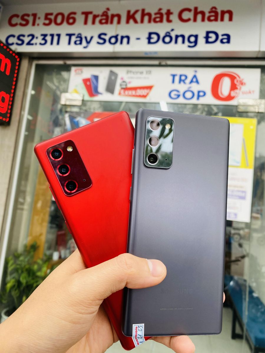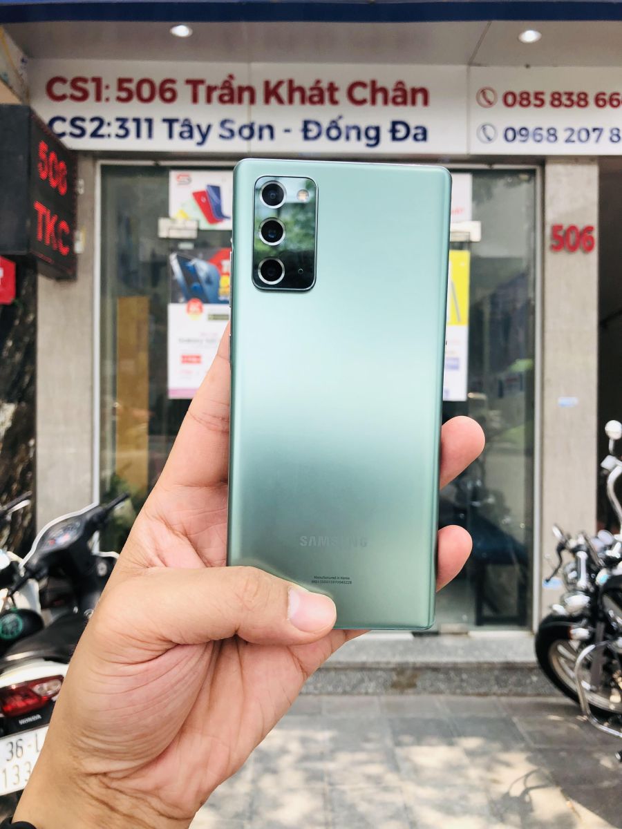 Mặt lưng của Galaxy note 20 256GB được hoàn thiện bằng vật liệu kính nhựa. Theo như hãng chia sẻ, vật liệu làm mặt lưng này mang tên gọi là Poly Carbonat với đặc tính là bền hơn và dễ tạo hình hơn hẳn các vật liệu thông thường khác. Ngoài ra phiên bản màu bóng của điện thoại cũng rất khó để phân biệt được với vật liệu kính thông thường. Còn phiên bản màu nhám thì nhìn giống với màu mặt lưng của Galaxy Note 20 Ultra.