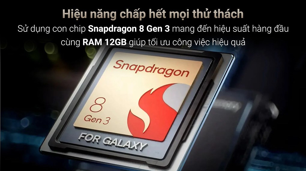 Galaxy S24 Ultra được trang bị Snapdragon 8 Gen 3 for Galaxy, con chip mạnh mẽ nhất hiện nay dành cho Android, kết hợp cùng RAM 12GB và bộ nhớ trong lên đến 256GB / 512GB / 1TB.